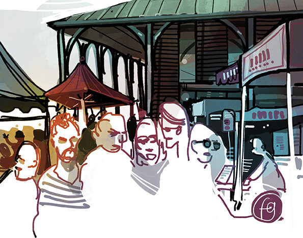 Réaliser des croquis en live dans un centre commercial consiste d’abord à observer attentivement l’environnement. Il s’agit de capter rapidement l’ambiance et les mouvements autour
