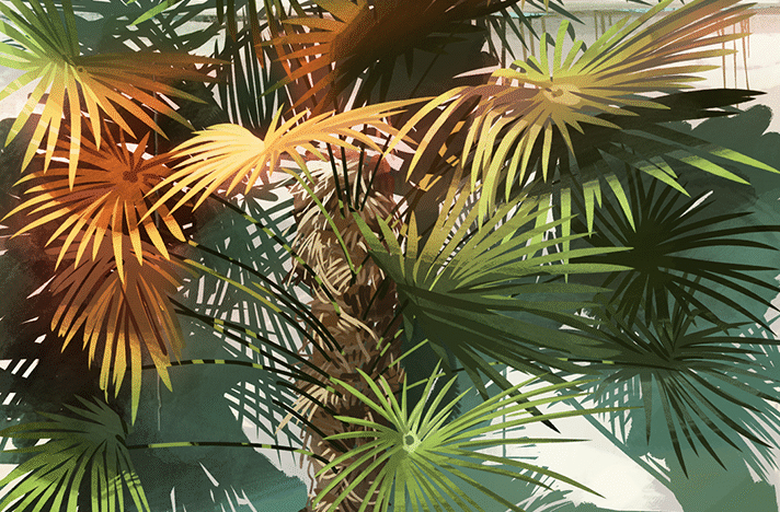 Cette peinture digitale met en scène un palmier de plein pied, dont les branches mortes, aux teintes dorées chaleureuses, projettent sur un mur les ombres