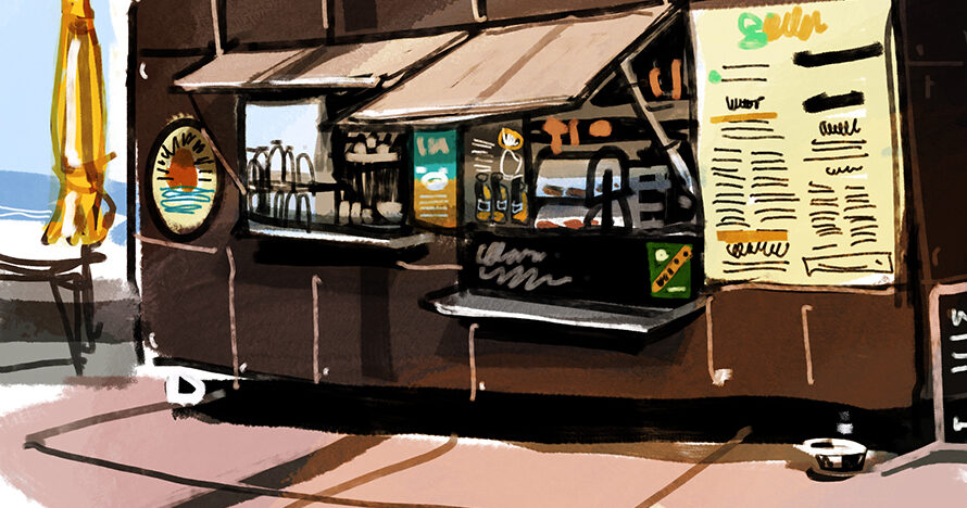 Cette peinture digitale saisit avec vivacité l’ambiance vibrante d’un restaurant de bord de plage en plein cœur de l’été. Face à la mer, le bleu