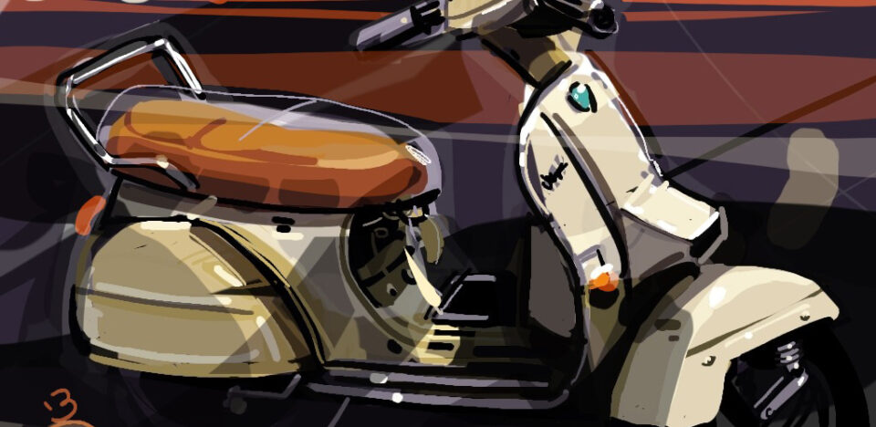 Scooter vintage stationné sur le trottoir du boulevard Montmartre à Paris, capturé en une soirée d’hiver 2013 — une scène urbaine emblématique qui illustre l’esprit