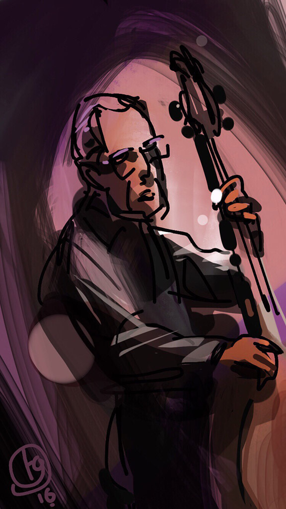 Le festival de Jazz à Antony à l’Espace Vasarely, dans une ambiance cosy un croquis qui met en avant le contrebassiste d’une formation d’un trio composée de piano, et batterie.