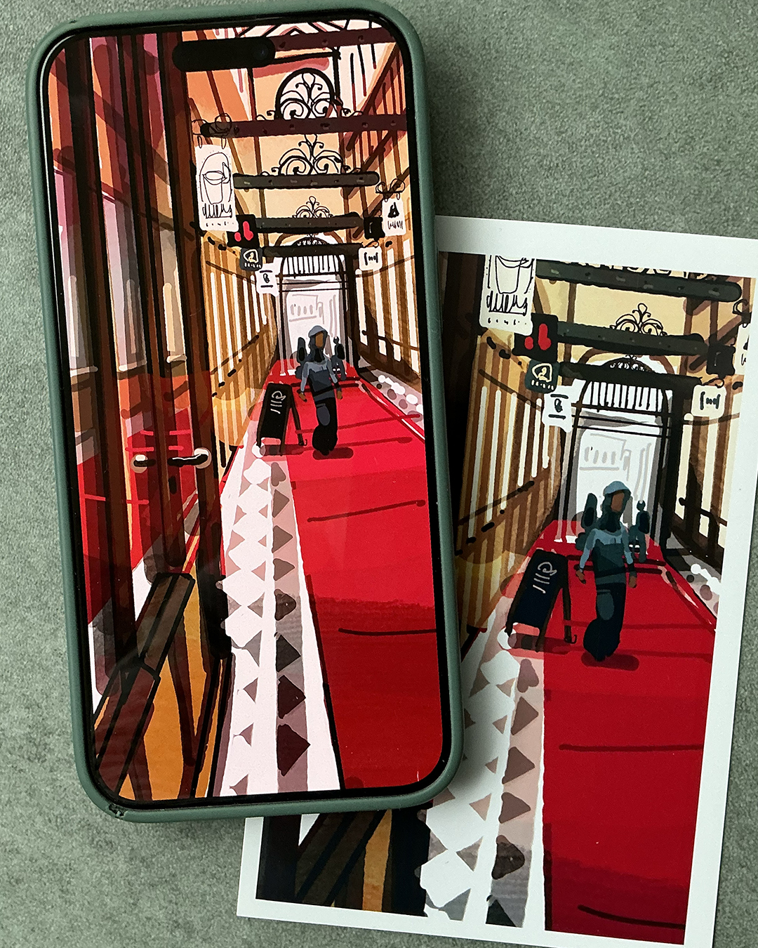 Cette balade parisienne se déroule entre le quartier Montorgueil et la rue Saint-Denis, dans un secteur très fréquenté du centre de Paris. Le passage du Grand Cerf devient le point d’arrêt principal de cette sortie : un passage couvert et lumineux, avec sa verrière et ses boutiques alignées. Le croquis est réalisé directement sur iPhone.