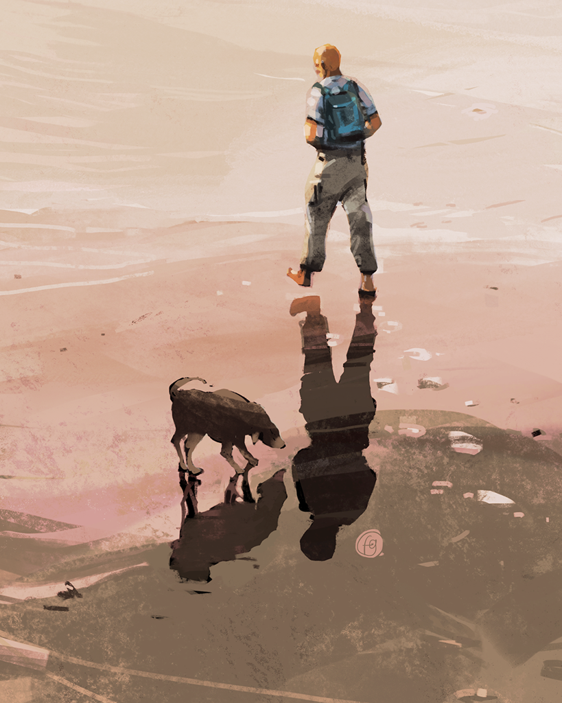 Un homme marche paisiblement sur la plage emblématique de La Concha à San Sebastián, accompagné de son chien fidèle , dans cette fin de journée empreinte de douceur et d’intimité. La lumière chaleureuse du soleil bas d’octobre joue sur le sable mouillé, créant des reflets délicats qui semblent danser au rythme des vagues calmes. Cette atmosphère apaisante et conviviale souligne la complicité silencieuse entre l’homme et son compagnon, deux silhouettes unies dans leur promenade au cœur de la nature urbaine. La simplicité des formes et la palette aux tons rosés enrichissent encore cette sensation de sérénité, comme une invitation à s’imprégner pleinement de ce moment suspendu. Réalisée sur Procreate, cette œuvre numérique restitue avec finesse l’essence d’un instant de paix, entre la beauté du paysage basque et la tendresse d’une relation unique.