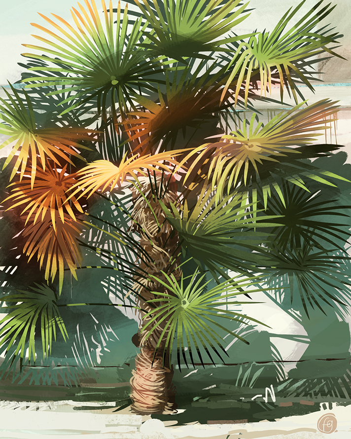 Cette peinture digitale met en scène un palmier de plein pied, dont les branches mortes, aux teintes dorées chaleureuses, projettent sur un mur les ombres marquées d’une journée d’été. La lumière éclatante caresse chaque détail, dessinant un jeu d’ombres et de lumières qui donne vie à cette végétation figée. Les traces du temps, visibles à travers quelques coulures subtiles, ajoutent une dimension poétique et authentique à cette œuvre contemporaine, conférant profondeur et caractère à la composition. Plus qu’un simple décor, ce palmier devient un symbole de la chaleur estivale, de la nature qui évolue et s’impose dans l’espace urbain.