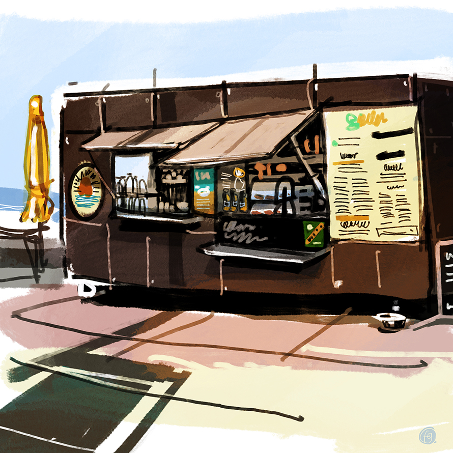 Cette peinture digitale saisit avec vivacité l’ambiance vibrante d’un restaurant de bord de plage en plein cœur de l’été. Face à la mer, le bleu intense du ciel contraste vivement avec le métal patiné et rouillé des parois d’un food truck, emblématique du littoral animé. Le jeu des ombres profondes, accentué par un soleil estival éclatant, souligne la lumière crue et chaleureuse qui illumine cette scène balnéaire typique de la haute saison.