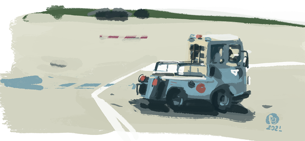 Ballet incessant de petites voiturettes circulant entre les avions sur le tarmac de l’aéroport d’Orly. Ces véhicules spécialisés transportent les bagages des voyageurs jusqu’aux avions, assurant le chargement rapide et efficace des valises et sacs. Après quelques escalators, je surplombe la scène.