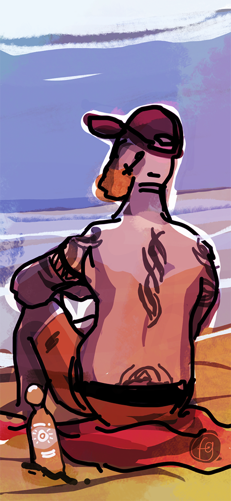 Le ciel est au zénith, intense et sans nuages, tandis que le sable brûlant de la plage des Chambres d’Amour invite à poser ses pas avec précaution. Les tee-shirts tombent, laissant apparaître des corps marqués de tatouages graphiques et audacieux, qui captivent le regard et inspirent l’envie de dessiner. Crème solaire et casquettes se mêlent à cette ambiance estivale, dressant une scène vibrante et pleine de vie sous le soleil éclatant de la Côte basque.